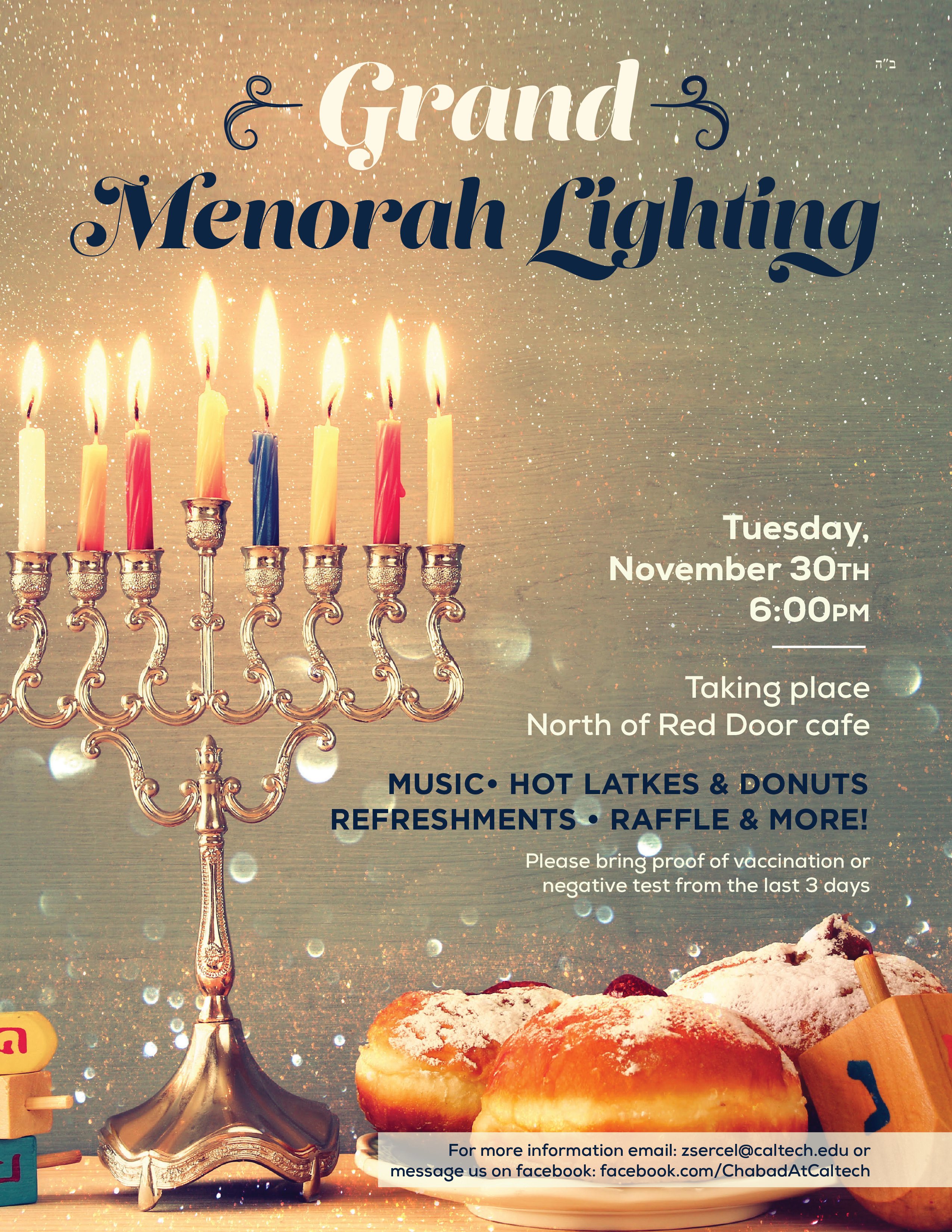 The student club Chabad at Caltech will be hosting its annual Grand Menorah Lighting to celebrate the third night of Chanukah on Tuesday, November 30 at 6 pm PST. Please join us outside Red Door and Browne Dining Hall, along with special guest President Rosenbaum, to light up the night together!