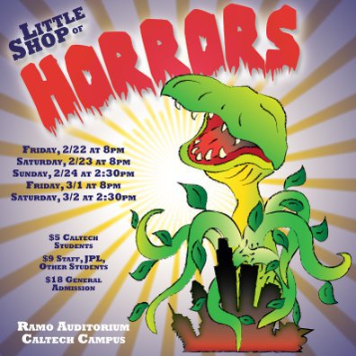 Darkly funny and always catchy, Little Shop of Horrors runs for five performances in Caltech's Ramo Auditorium: Friday, 2/22 at 8:00 p,m,; Saturday, 2/23 at 8:00 p.m.; Sunday, 2/24 at 2:30 p.m.; Friday, 3/1 at 8:00 p.m.; and Saturday, 3/2 at 2:30 p.m.